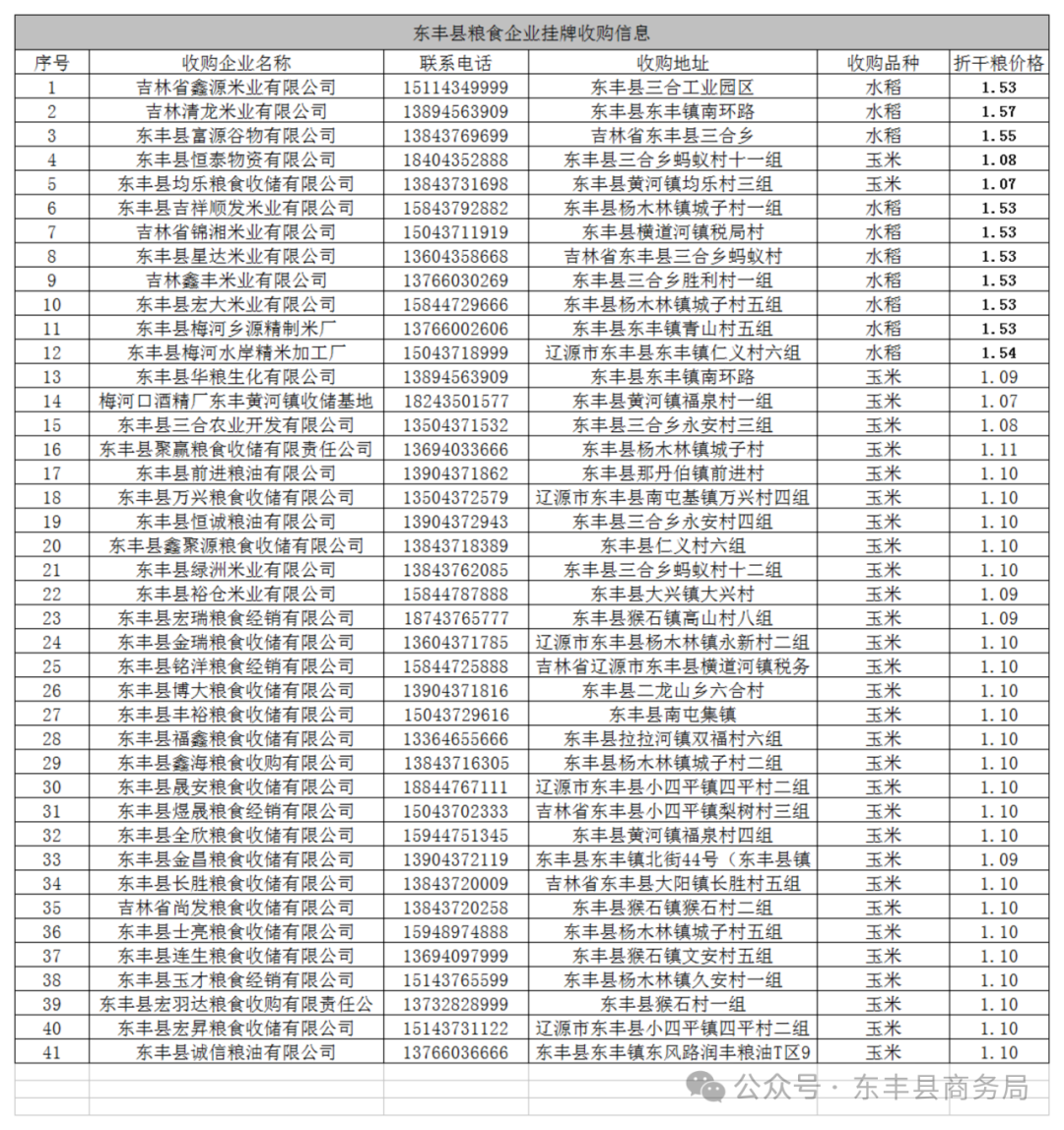 1. 東豐縣華糧生化有限公司收購價格為2180元/噸(三等,折干糧),收購地址為東豐縣南環(huán)路。