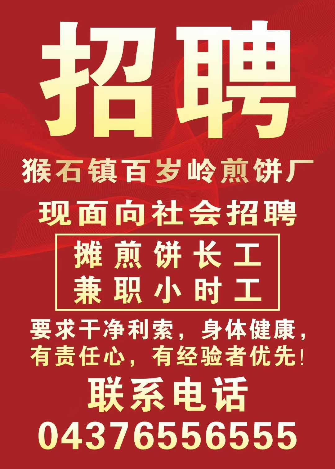猴石鎮百歲嶺煎餅廠現面向社會招聘工人。要求:干凈利索、身體健康,有責任心。有經驗者優先。
